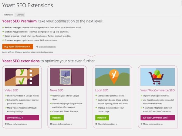 For the last few years, Yoast SEO has had an extensions page. We’ve now replaced that extensions page with a Go Premium page. It explains the features of Yoast SEO Premium and our extensions a lot better. It’s also much more in line with our current style, as you can see: