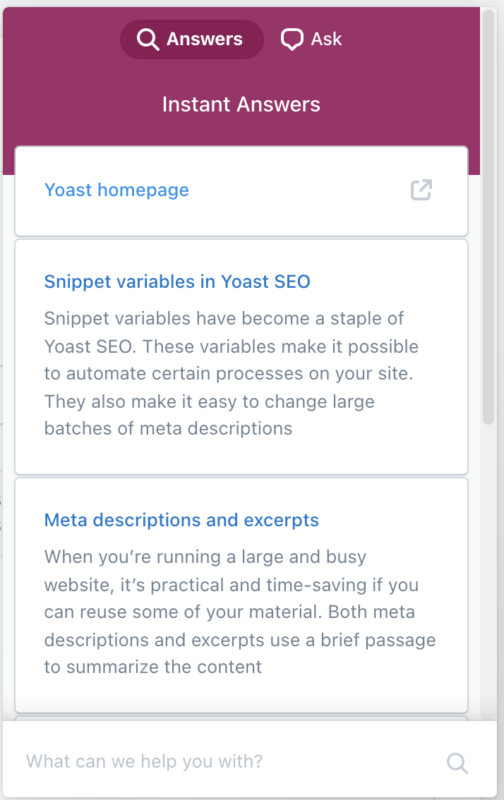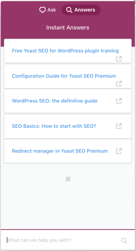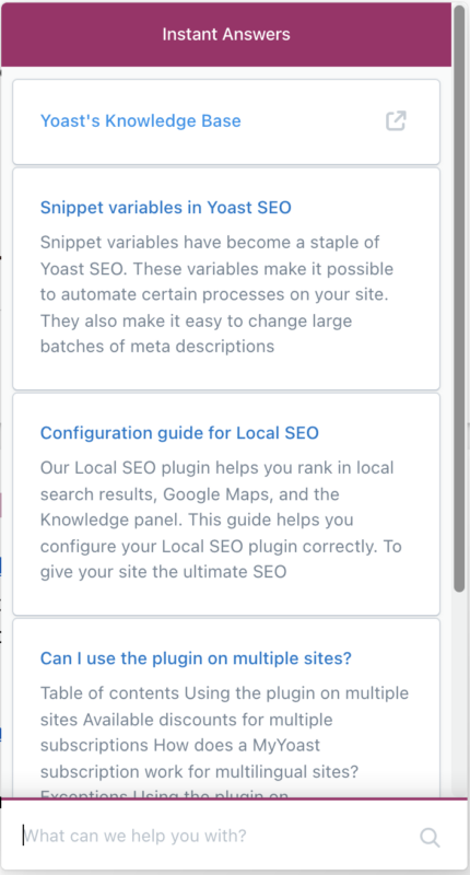 We offer a help beacon in your MyYoast account. Clicking the purple “Help” button at the bottom-right of a page in MyYoast opens a search to quickly find if we already have an answer to the question you have.