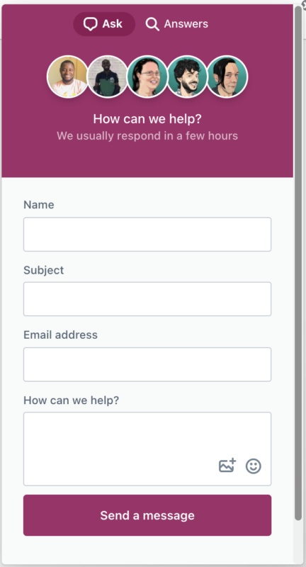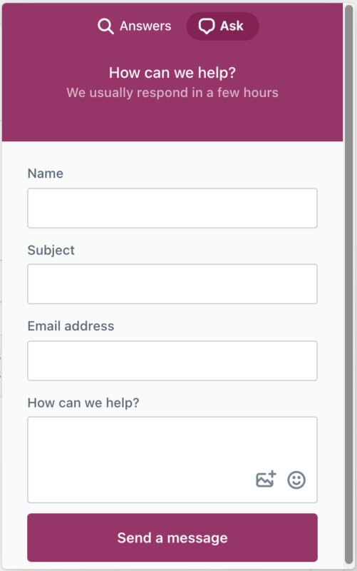 In the help beacon, you can choose between “Ask” and “Answers” at the top. Clicking the “Answers” button will allow you to search for answers to your questions. If you didn’t find an answer to your question, you can click “Ask”. This will give you the option to securely send your question to our support team.