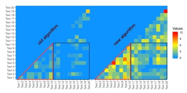 Improving the internal linking tools started with research and building a demo to prove that it would work. Natalia: “For this demo, we took ten yoast.com texts strongly related to each other — all of them covered the topic of branding. We also selected ten control texts that were not specifically related to each other or to the branding texts from the first group. We ran the texts through both old and new internal linking algorithms and visualised how likely the algorithms would suggest every two texts to each other. As you see on the plot below, the old algorithm did not do a very good job. Strongly related texts (Text 1 through Text 10) were only considered slightly better linking suggestions for each other by the algorithm [red triangle], than unrelated texts (Text 11 through Text 20) [blue square]. The new algorithm definitely preferred linking strongly related texts over unrelated texts.”