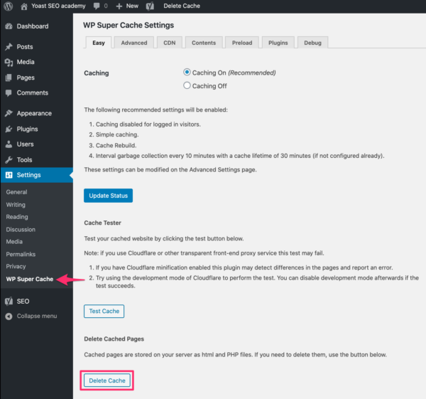 Clearing your cache with WP Super Cache