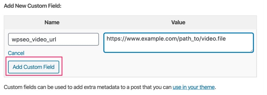 Enter a recognizable and reusable custom field name under the Name. Enter the full URL to the video for this page/post in the Value input field. Or add in the content you want Yoast SEO to scan.