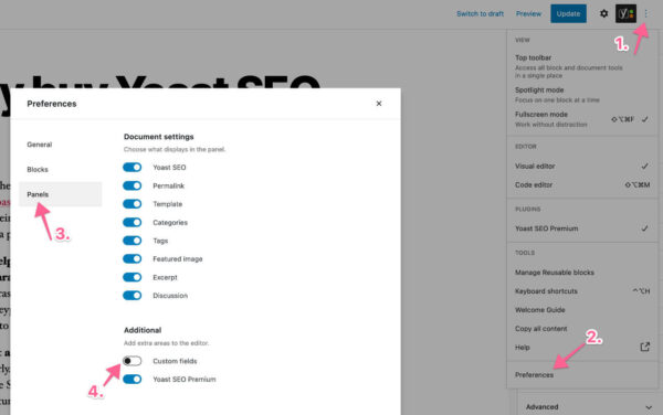 To enable Custom fields in the post and page editing screen, click on the three vertical dots in the top right corner. That will open the More tools & options menu (1 in the image below). Then, click Options at the bottom of the menu (2 in the image below). Finally, check the box next to Custom fields (3 in the image below). The Custom fields will be added. You can find them at the bottom of your Post or Page editing screen.