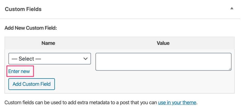 Once you create a custom field, you can reuse the same field in other posts. All you need to do is select the field from the Name drop-down instead of creating a new one each time.