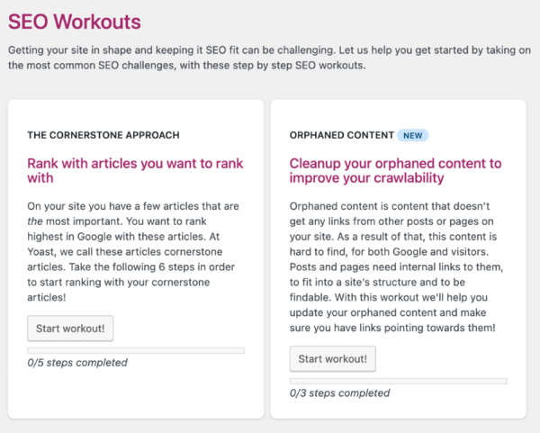 You’ll find Yoast’s SEO workouts in the left-hand menu under SEO –> Workouts. There, you can select the orphaned content workout:
