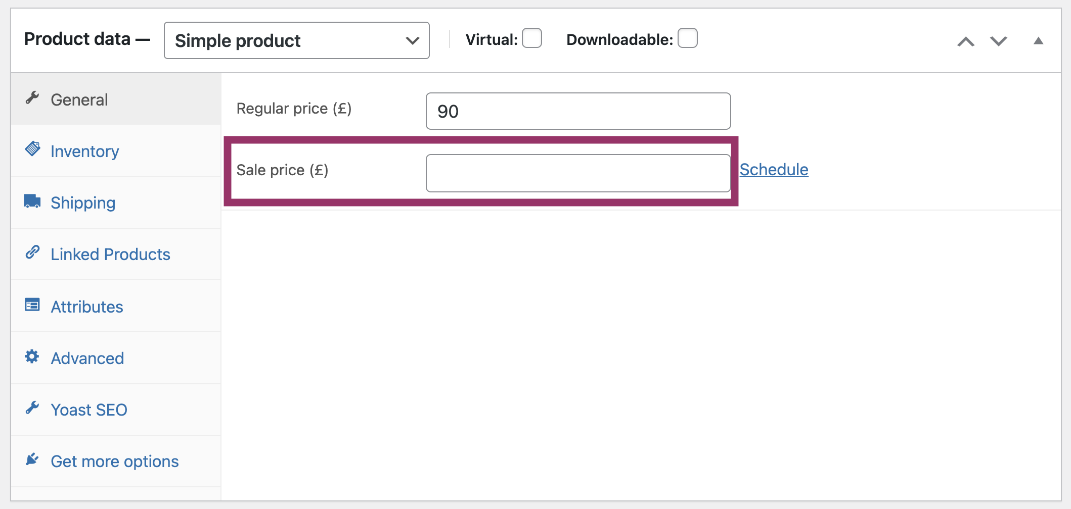 - In the General tab, add the Sale price in the appropriate field (outlined below).