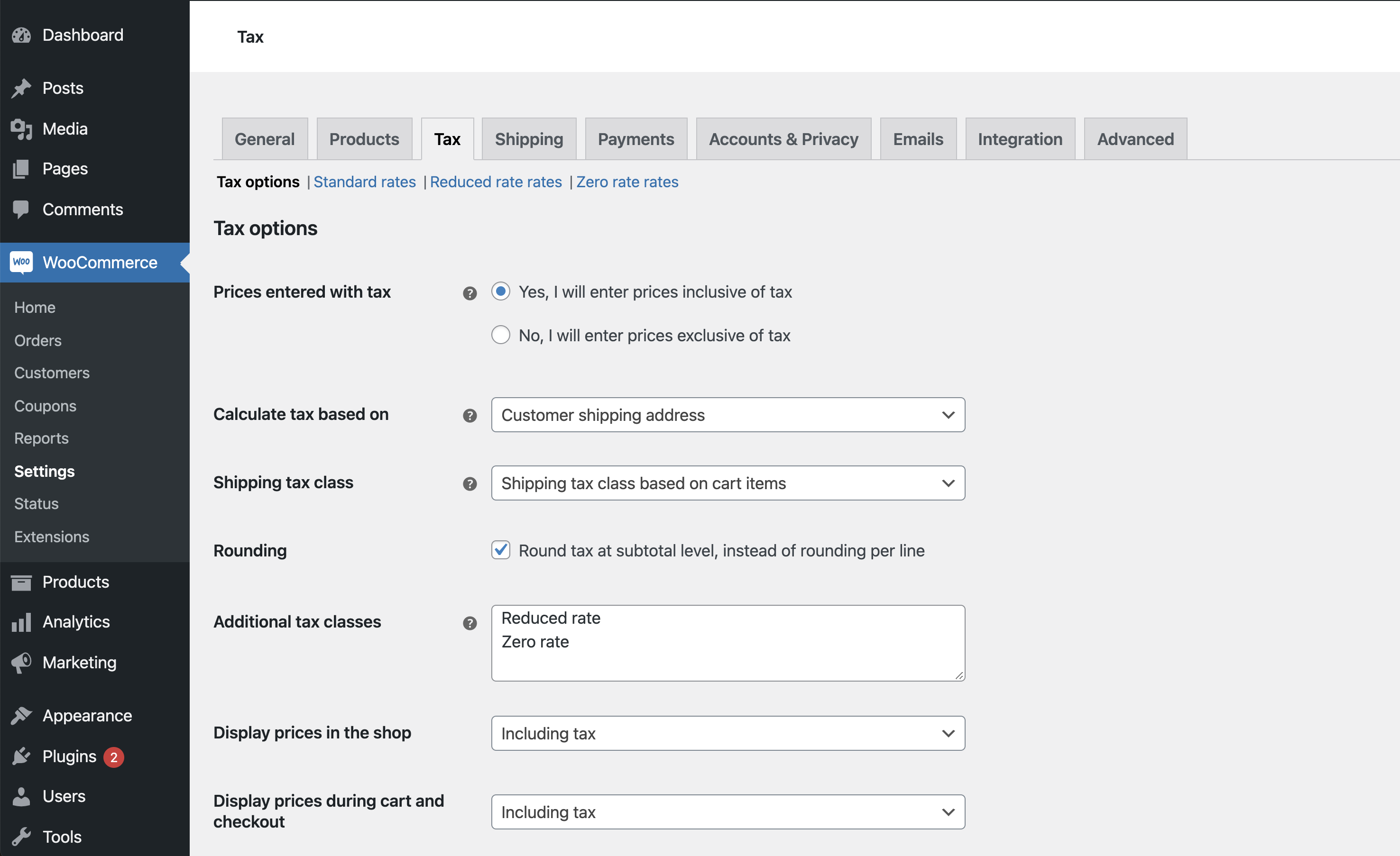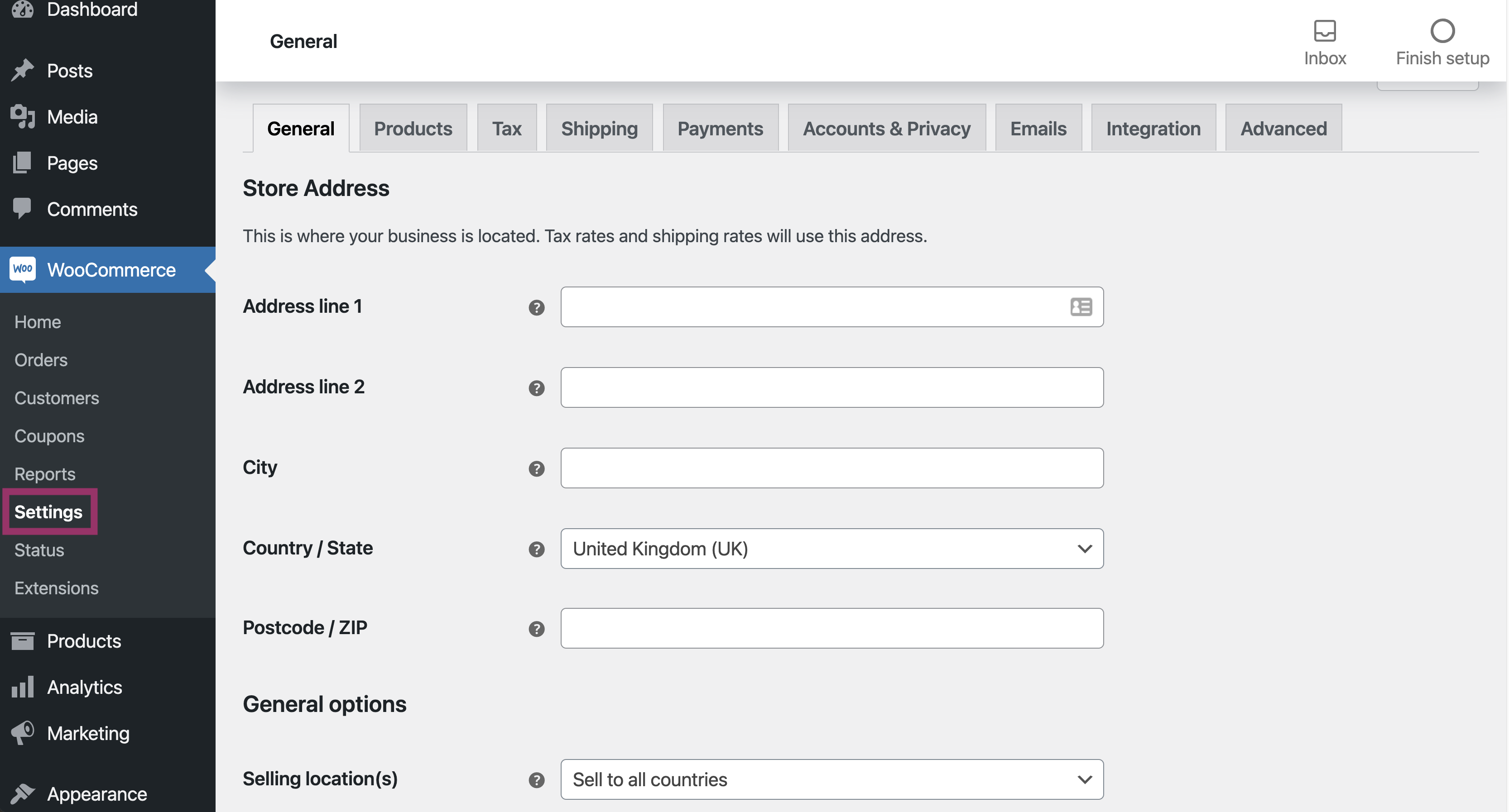 - Go to the WooCommerce menu item in the Admin menu, and select Settings.