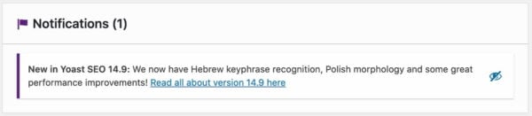 The notification “New in Yoast SEO 14.9: We now have Hebrew keyphrase recognition and some great performance improvements! Read all about version 14.9 here” does not disapper after acknowledging and reading it…