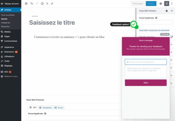 If you use Yoast SEO Premium in French, Italian or Russian, you can see the new feedback option just below the focus keyphrase field. Simply click the link, and fill in the fields in the popup. We’re asking you to supply us with the following: