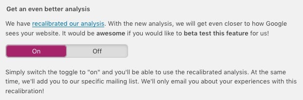 As mentioned, we need feedback. We’re not going to change anything without your input. By activating the beta analysis, you can provide us with insights into how you experience the new analysis. Please use the new version of the SEO analysis like you normally do and report back. You’ll notice that it grades your content slightly different. We’ve made it extremely easy for you to take part in our beta test. Here’s how you can start: