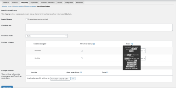Click on the Click here link to access the specific Local Store Pickup settings. These allow people to pickup their ordered products (WooCommerce) at the Locations, setup by the Local SEO plugin.
