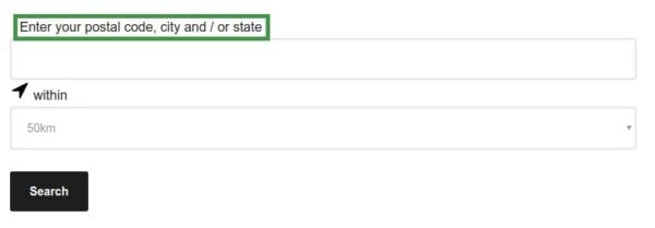 The store locator’s first field, by default, is labelled with: Enter your postal code, city and / or state