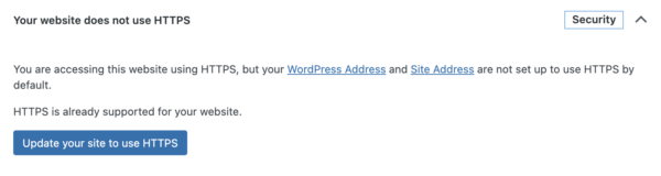 Since the 5.7 release, WordPress automatically detects whether your WordPress website runs on a hosting package that supports HTTPS but is not yet set up to use HTTPS by default. If it is not, you will see a critical notification in the Site Health tool. You can find the Site Health tool on your WordPress Dashboard, or by going to Tools->Site health.