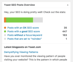 Your WordPress dashboard should give you important information at a glance. Our old dashboard widget was in desperate need of a new coat of paint and an overhaul of its contents. The new widget now shows you how your SEO is doing. You’ll see how many posts have good SEO score and how many are just OK or which ones don’t have a focus keywords attached to it. Keeping up with our SEO articles has become much easier since we’ve added links to the most recent posts on yoast.com.