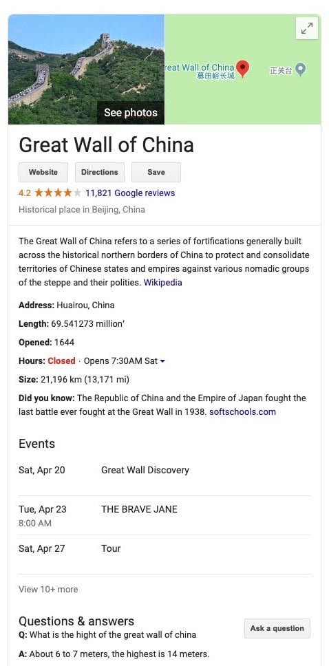 If you search for a specific company, you’ll likely see a big block of information on the right (sometimes the top) of your screen. That’s Google’s Knowledge Graph. This block – also known as the Knowledge Graph Card or Panel – contains relevant, context-specific information regarding your search, powered by the Knowledge Graph.