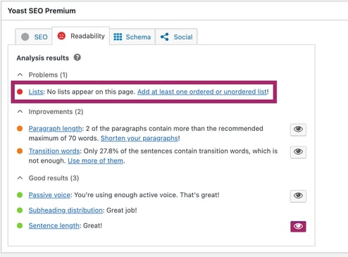 If you omit the <ol> or <ul> tags, Yoast SEO will not recognize the list, and you will get a red traffic light. This is because, without those tags, screen readers can’t figure out the content, which makes it less accessible.