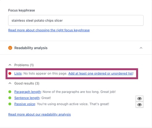 The list assessment is part of the Readability tab in Yoast SEO (see the screenshots below, click on the appropriate tab for the app you are using). The check is quite simple. If you have at least one list (ordered or unordered) in your product description, you will get a green traffic light. If you don’t, you’ll get the feedback that reminds you to add one.