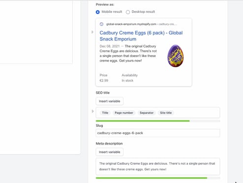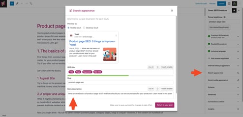 Adding a meta description is easy if you’re on WordPress or Shopify and using Yoast SEO. Firstly, you can write it in the Google preview section of Yoast SEO. But Yoast SEO also gives you feedback on it in the SEO analysis. The plugin checks the meta description length and whether you’ve used your focus keyphrase. So, let’s see how the plugin helps you and what you can do with it.