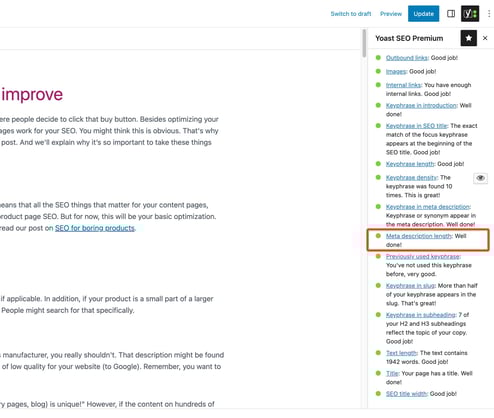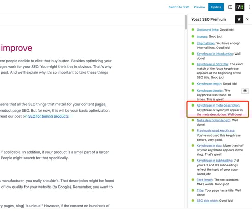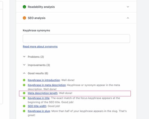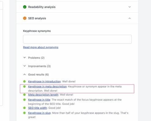 Yoast SEO checks if and how often you use the words from your focus keyphrase in the meta description text. In addition, if you use Yoast SEO Premium, it also considers the synonyms you enter. If you overdo it, the plugin advises you to limit the use of your focus keyphrase.
