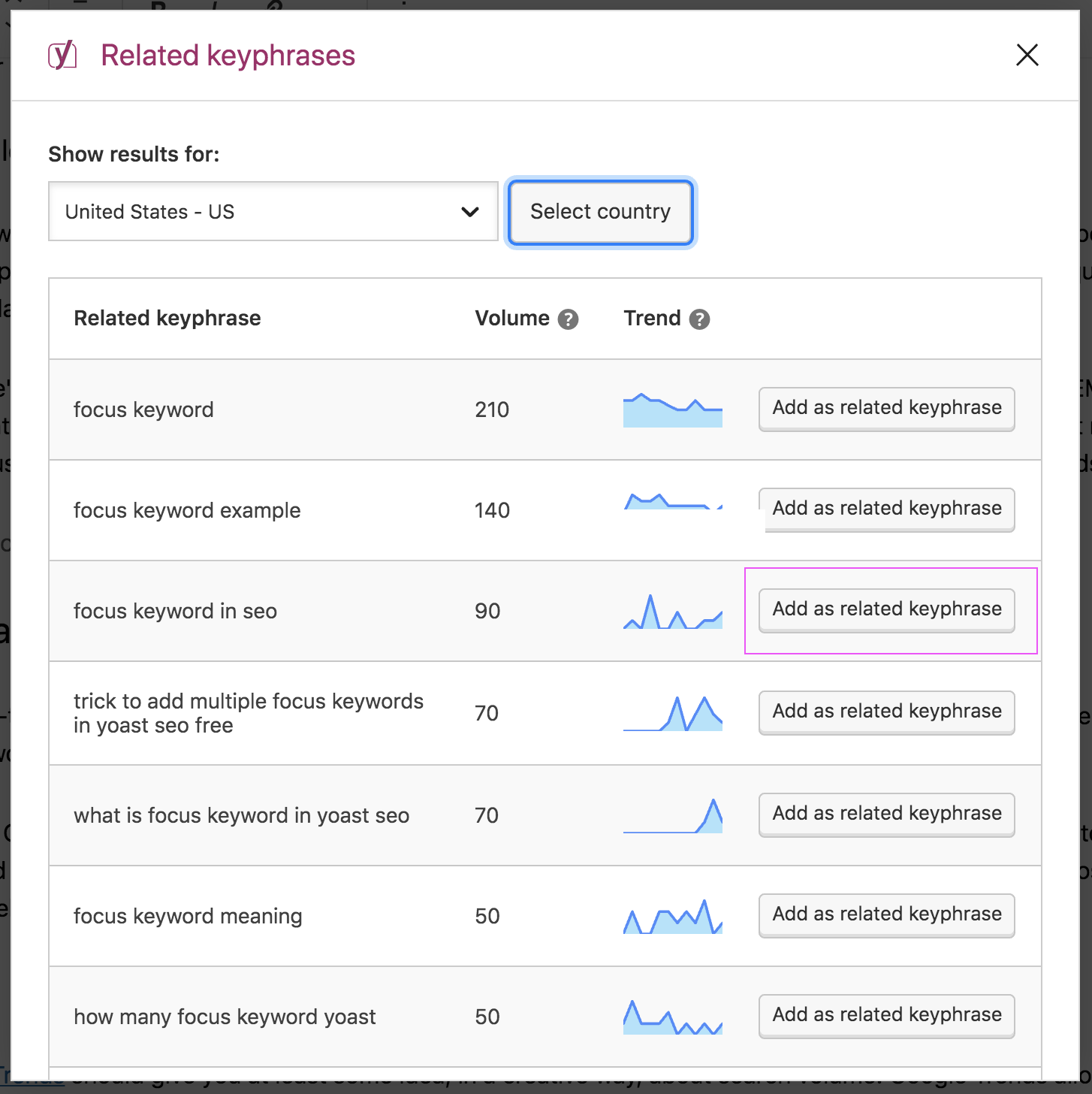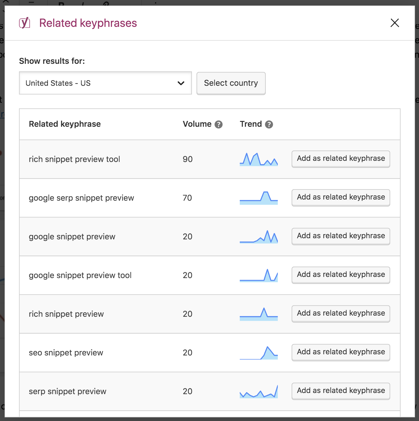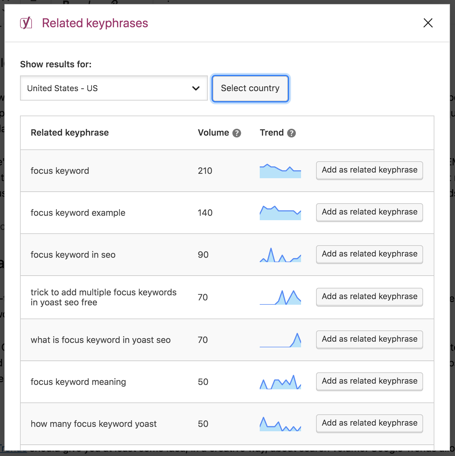 For instance, you can check out the search volume (how often it is searched for in a specified period) and trends (how that changed over time). Now, you can easily compare the related keyphrases and decide which one(s) you want to focus on in your current or other posts.