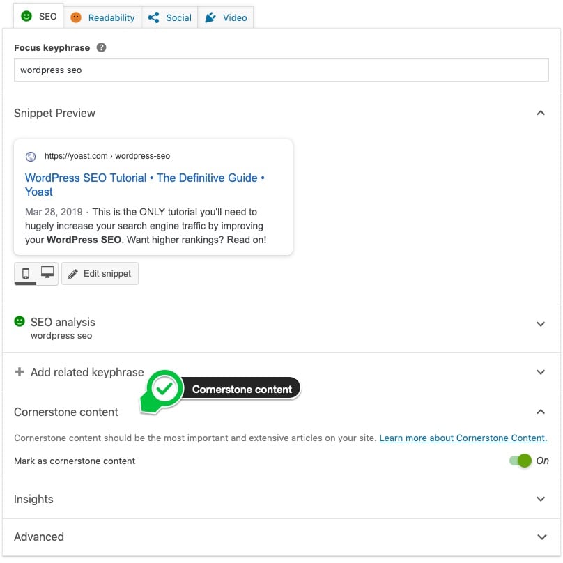 The concept of cornerstone content is so important, that our Yoast SEO for WordPress plugins and Yoast SEO for Shopify app include an option to indicate whether or not a page is cornerstone content. If you mark pages as cornerstone content, Yoast SEO helps you write kick-ass content and build a solid internal linking structure.