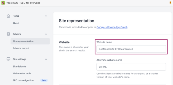 If you want a different name to be displayed in the search results, you can change the site name in the field behind “Website name”. This will overwrite the default WordPress site name in the structured data code that Yoast SEO outputs for the