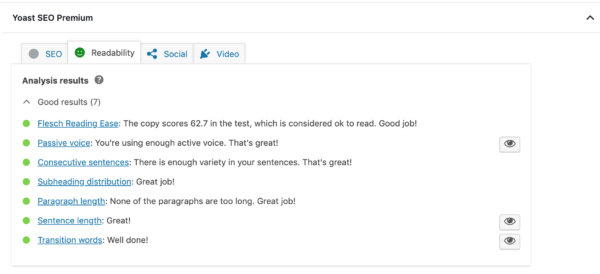 Without wanting to brag: I have a green bullet for readability on all the blog posts I write. However, I often fail to comply with at least one of the checks. For this blog post, I had a hard time complying with passive voice (but still got a green bullet in the end). In other cases, I got orange bullets for transition words.