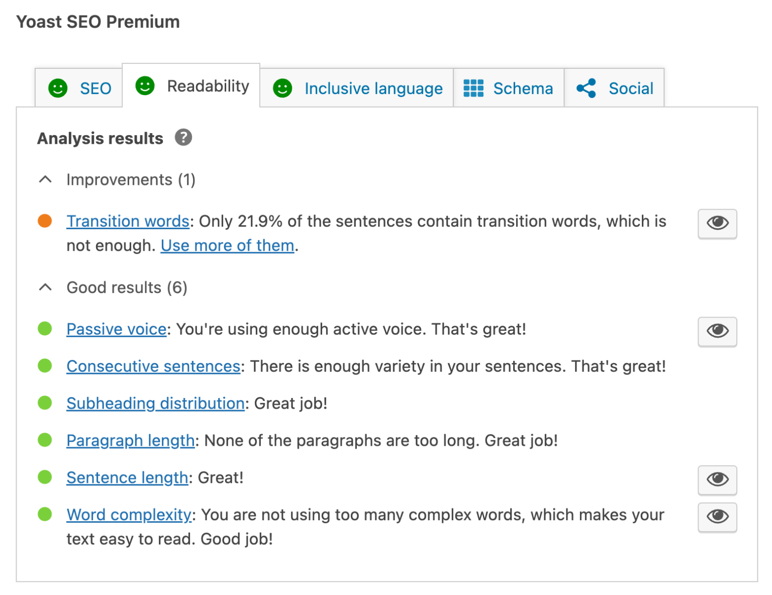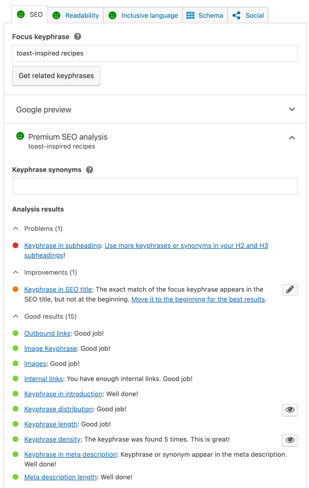 Writing is hard. Optimizing your post all by yourself is hard. That’s why Yoast SEO tries to make it easier for you! We’ll check your posts for readability, paragraph length, word complexity, your use of inclusive language, and make suggestions for improvements. We’ll help you to Yoast your post. But in the end, it will also remain some work from your side.