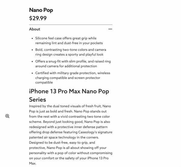 One of the most powerful tools in your writing kit is the bulleted list. Especially for product pages, adding a good list makes it much easier for the customer to scan its most essential features. In this example, Caseology provides consumers with a good feel for the product. The list answers most questions, while the paragraph below describes why this product stands out from all the others. Yoast SEO for Shopify reminds you to add lists.
