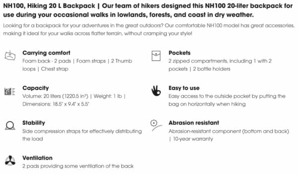 While not the most extended text in the history of product descriptions, Decathlon makes excellent use of supporting icons and text to make descriptions scannable and insightful. It gives a good idea of who made this product, for which audience to use under which circumstances. Customers can decide instantly if this is the product that warrants further investigation or if they should move on to the next one.