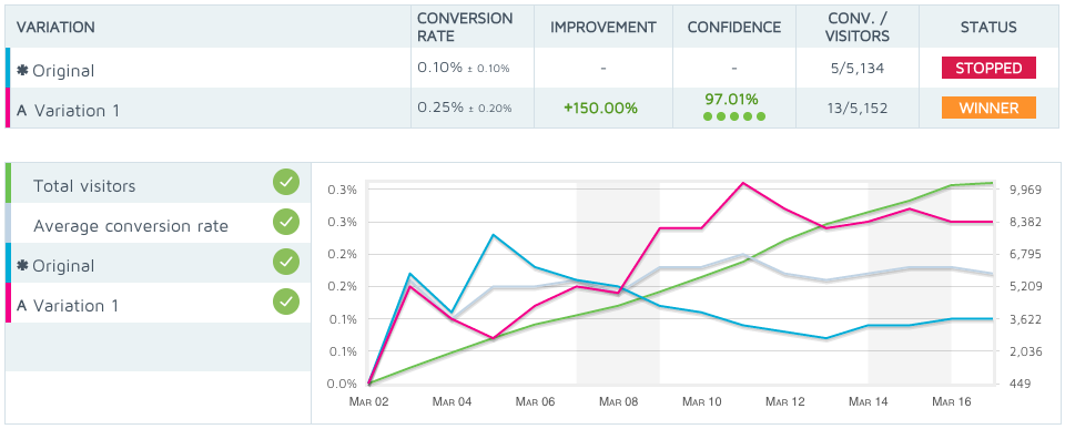 I always take a look at the trend of the test. This graph shows the conversion rate of the original version, the variation, the total visitors and the average conversion rate. The original version (blue line in this case) and the variation (purple line) should not be too close during the duration of the test. If there’s just a spike at the end that made the test variation the winner, you know the results aren’t trustworthy. In this case, it looks pretty good, as the variation outperformed the original pretty soon. But don’t get too ecstatic and stay aware of the low number of actual conversions, in this case.