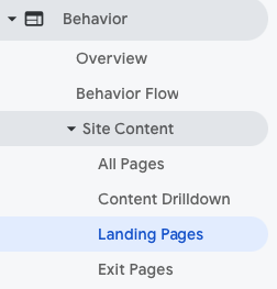 You’ll find Landing Pages in Google Analytics in the Behaviour tab