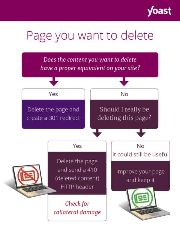 Whenever you delete a page (or post) from your site, you also delete one or more URLs. That old URL, when visited, will usually return a ‘404 not found’ error, which is not the best thing for Google or your users. Is that what you really wanted to happen? You could redirect that deleted page to another page, or maybe – if you really want the content gone from your site – serving a 410 header would actually be a better idea. This post explains the choices you have and how to implement them.