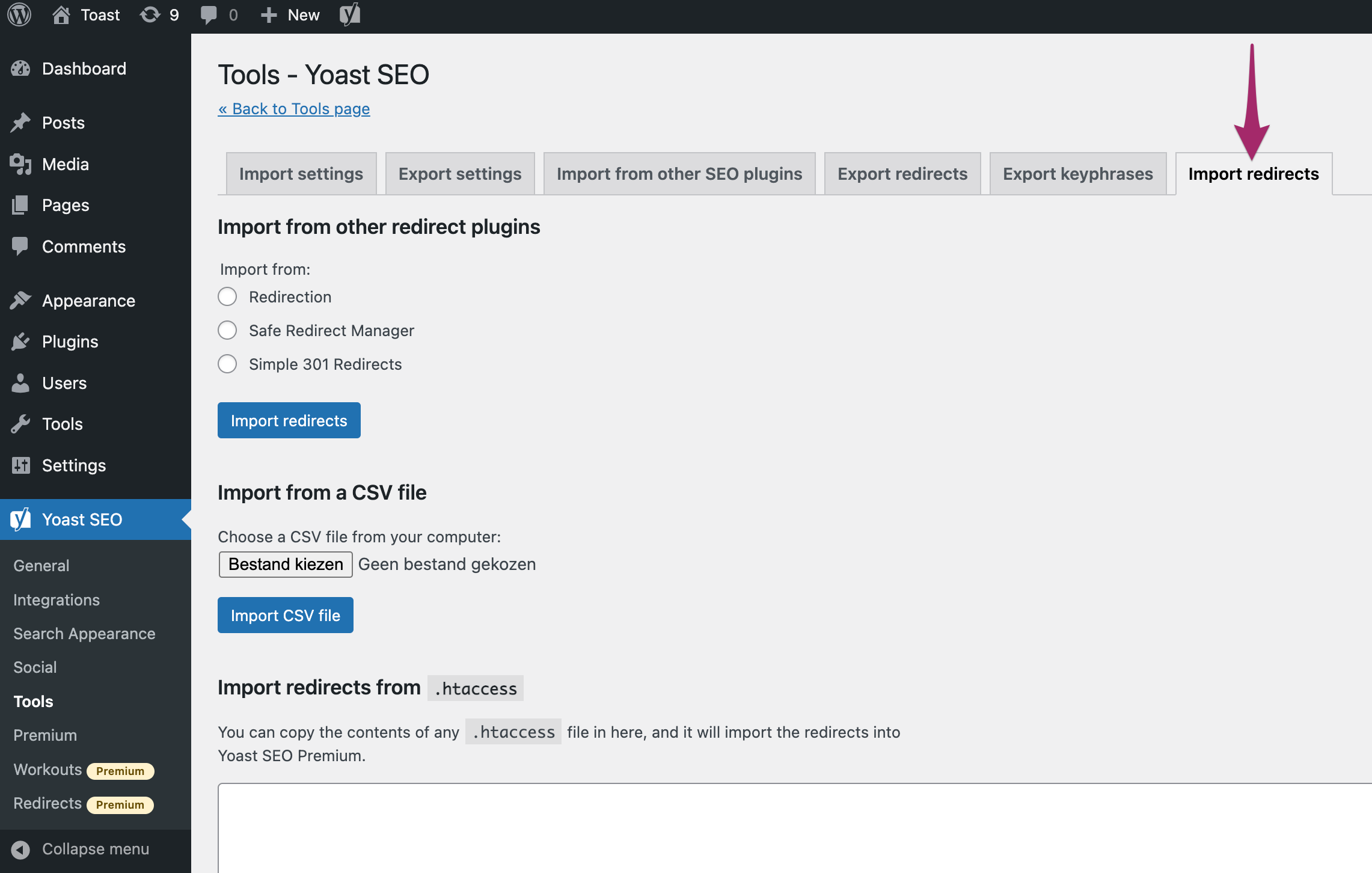 Yoast SEO Premium includes the option to import your redirects from popular redirect plugins, from a .CSV file, or from an .htaccess file. You can find the redirect import feature by following the steps below.
