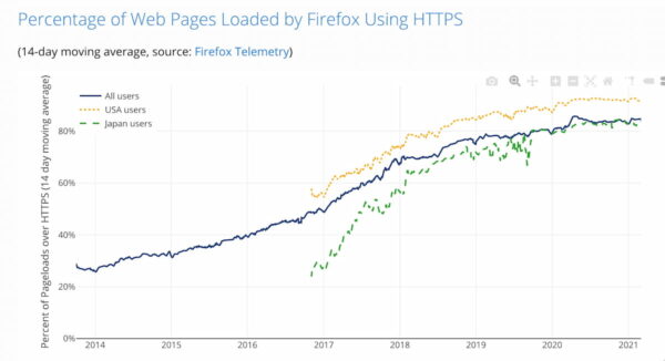 Percentage of web pages loaded via HTTPS