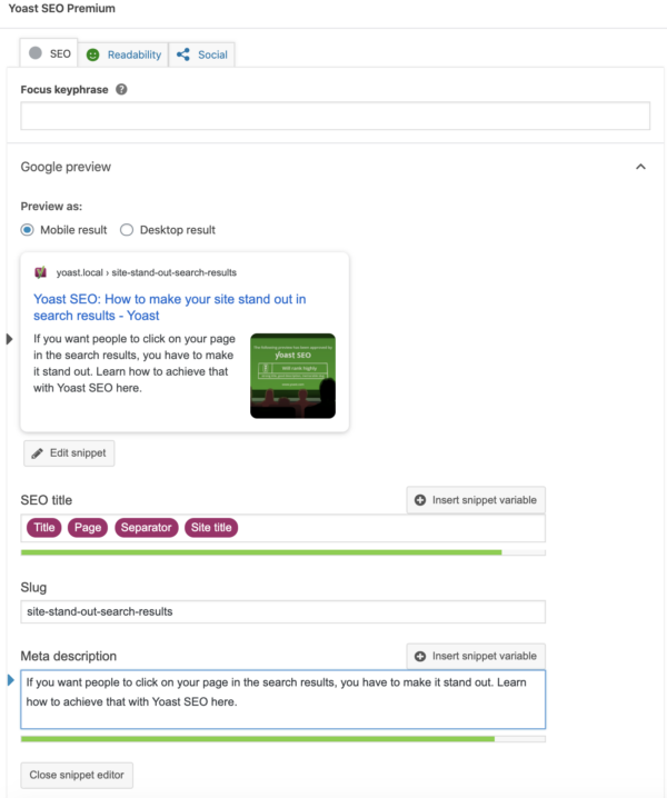 That’s it. You can easily optimize your mention in the search result pages if you use the snippet preview, and editor, in our free and premium Yoast SEO plugin. It’s an easy, convenient way to present Google with a ready-to-use, optimized snippet for their search result pages. Now go and optimize :)
