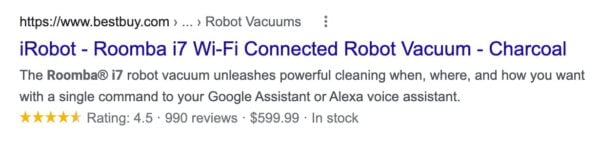 Structured data is also important for your product page SEO because the major search engines came up with this markup, not the W3C consortium. Google, Bing, Yahoo, and Yandex agreed upon this markup, so they could identify product pages and all the product elements and characteristics more easily. Why? So they could a) understand these pages a lot better and b) show you rich snippets like this: