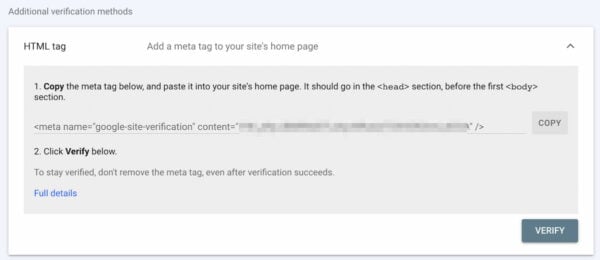 For WordPress users who use Yoast SEO, get the verification code via the ‘HTML tag’ method from the Ownership settings in Search Console. Copy the long, random string of characters.