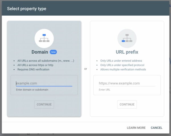 You must verify that you’re the owner when you’ve added a website. There are several options to verify your ownership. The Domain option only works with DNS verification, while the URL prefix supports different methods. You can learn more about the differences in Google’s documentation: adding a new property and verifying your site ownership. You can also use Google’s Site Kit WordPress plugin to connect Analytics and Search Console while giving you statistics in your site dashboard.