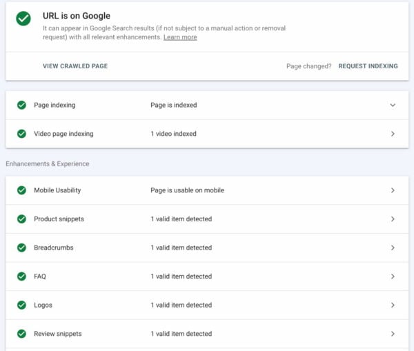 The Enhancements section lists all the structured data that Google found on your site and whether or not these are eligible for rich results.