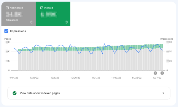 If you’re writing new content, your indexed pages should steadily increase. This tells you two things: Google can index your site, and you keep your site ‘alive’ by adding content.