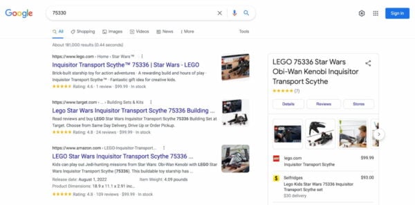 Many people use SKUs to search for a specific product on Google. Take LEGO fans, for instance — they live for the SKU codes that LEGO provides. Every set gets a unique five-digit number that makes a set instantly recognizable. For example, the LEGO Star Wars Inquisitor Transport Scythe set is number 75336. This number features prominently on the box, the catalog, and the website. In addition, every store selling LEGO worldwide will use this number in their product descriptions.