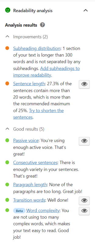Another way to improve your readability score is by structuring your text. What we mean by this is dividing your text up into reasonably sized paragraphs and using headings to divide your content into smaller sections. This makes your text scannable and it gives readers some room to come up for air in between your paragraphs. No one enjoys a wall of text that doesn’t give an overview of the subtopics that are being discussed. Read how to bring structure to your text here.