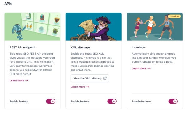 Yoast SEO creates an XML sitemap for your website automatically. Click on ‘SEO’ in the sidebar of your WordPress install and then select the ‘Site features’ tab below General. Scroll down to the APIs section: