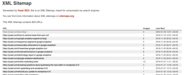As you can see, the Yoast.com XML sitemap shows several ‘index’ sitemaps: post-sitemap.xml, page-sitemap.xml, video-sitemap.xml etc. This categorization makes a site’s structure as straightforward as possible. So, if you click on one of the index sitemaps, you’ll see all the URLs in that particular sitemap. For example, if you click on post-sitemap.xml you’ll see all Yoast.com’s post URLs.