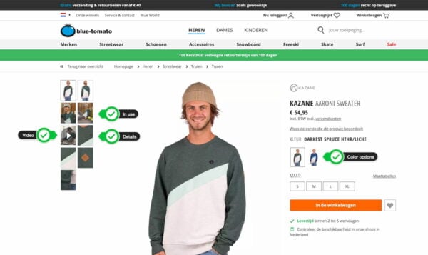 You want to be able to look at a product from all angles. Let’s look at that Blue Tomato example again. It shows that sweater being used, from the back and front, plus some details. You can really check the sweater from multiple angles.