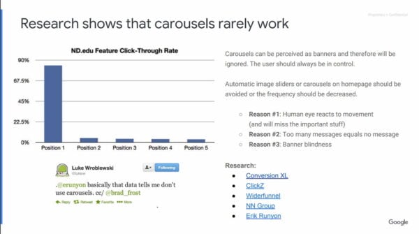 “Sliders please the owner of the site, but they deliver little to no value to the customers. The reason is that we are not going to sit there and wait for your ‘movie’ to play out. I’m also not a fan of sliders because for most businesses they provide an excuse not to think about personalization and being good at giving the customer the right answer, right away.”