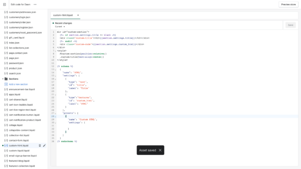 To add embed codes to a Home Page or Product Page, you need to create a custom section to accommodate this. This is relatively straightforward if you’re comfortable with basic HTML and web development. Go to the “Edit code” option within the “Action” drop-down in the theme menu. Next, add a section for custom HTML. You can then select this section for inclusion within the theme editor for the Home Page and Product Pages.