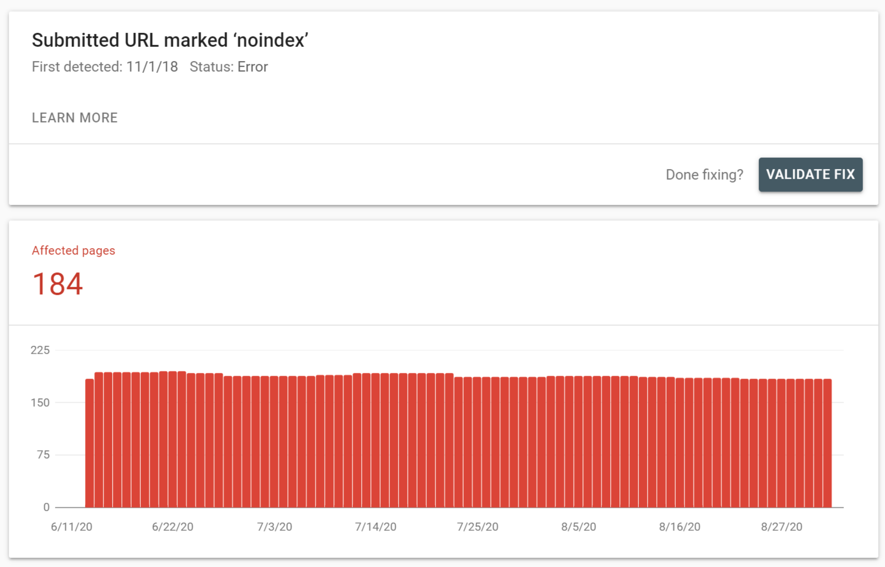 Because WordPress core’s XML sitemaps are much simpler than ours, using them alongside our SEO plugin might result in some unexpected behavior, or even SEO errors. For example, posts or pages which you mark as ‘noindex‘ (or otherwise ‘non-public’) will still be included in your sitemap. That sends ‘mixed signals’ to search engines, which might trigger errors and warnings in Google Search Console and other tools, like the example below.