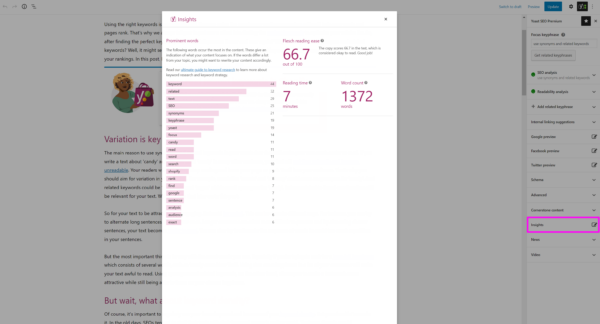 You can find the Flesch reading ease in the Insight tab within Yoast SEO. The feedback also contains links to resources where you can read more about the score and what you can do to improve it.